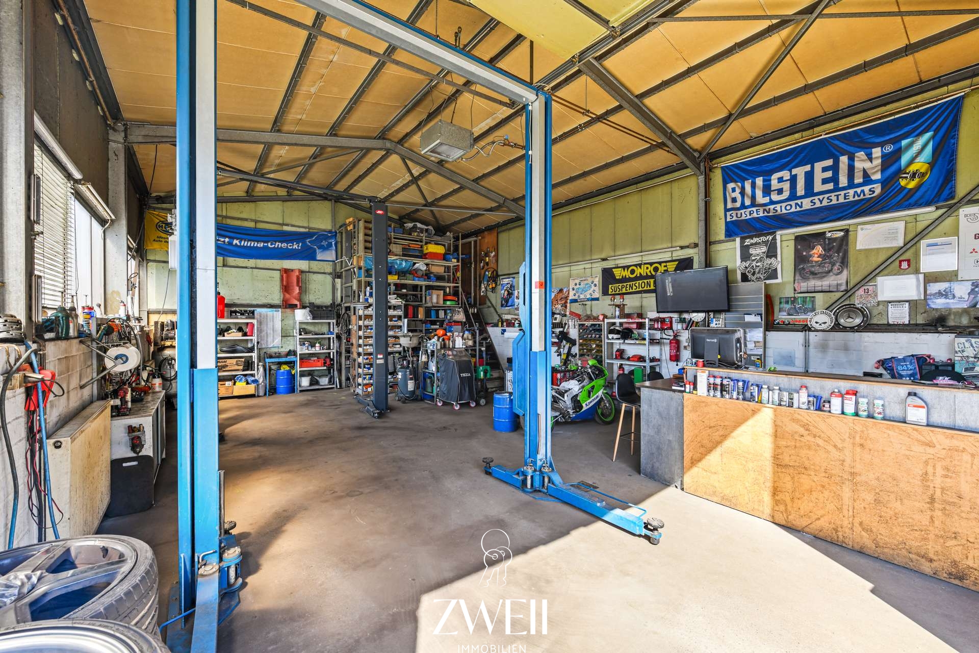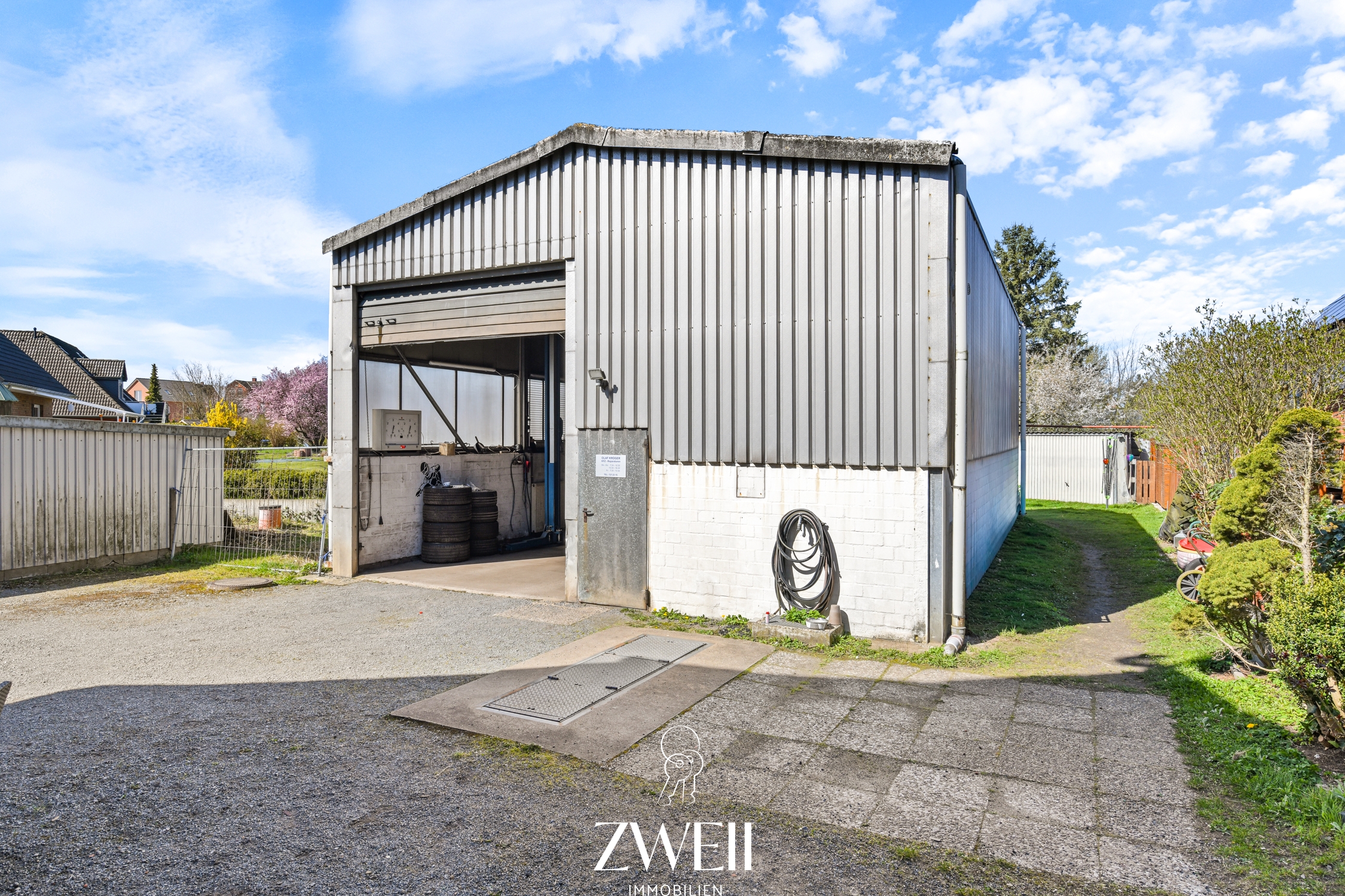 Auf dem insgesamt etwa 777 Quadratmeter großen Grundstück befindet sich im hinteren Bereich eine rund 100 m² große Autowerkstatt mit bestehender Gewerbeerlaubnis. Sie kann nach Belieben auch als Hobbyraum oder für handwerkliche Tätigkeiten genutzt werden. Beheizt wird die Werkstatt über eine Gaszentralheizung. Abgerundet wird das Angebot durch drei Garagen, die zusätzliche Stellplätze oder Lagermöglichkeiten bieten.